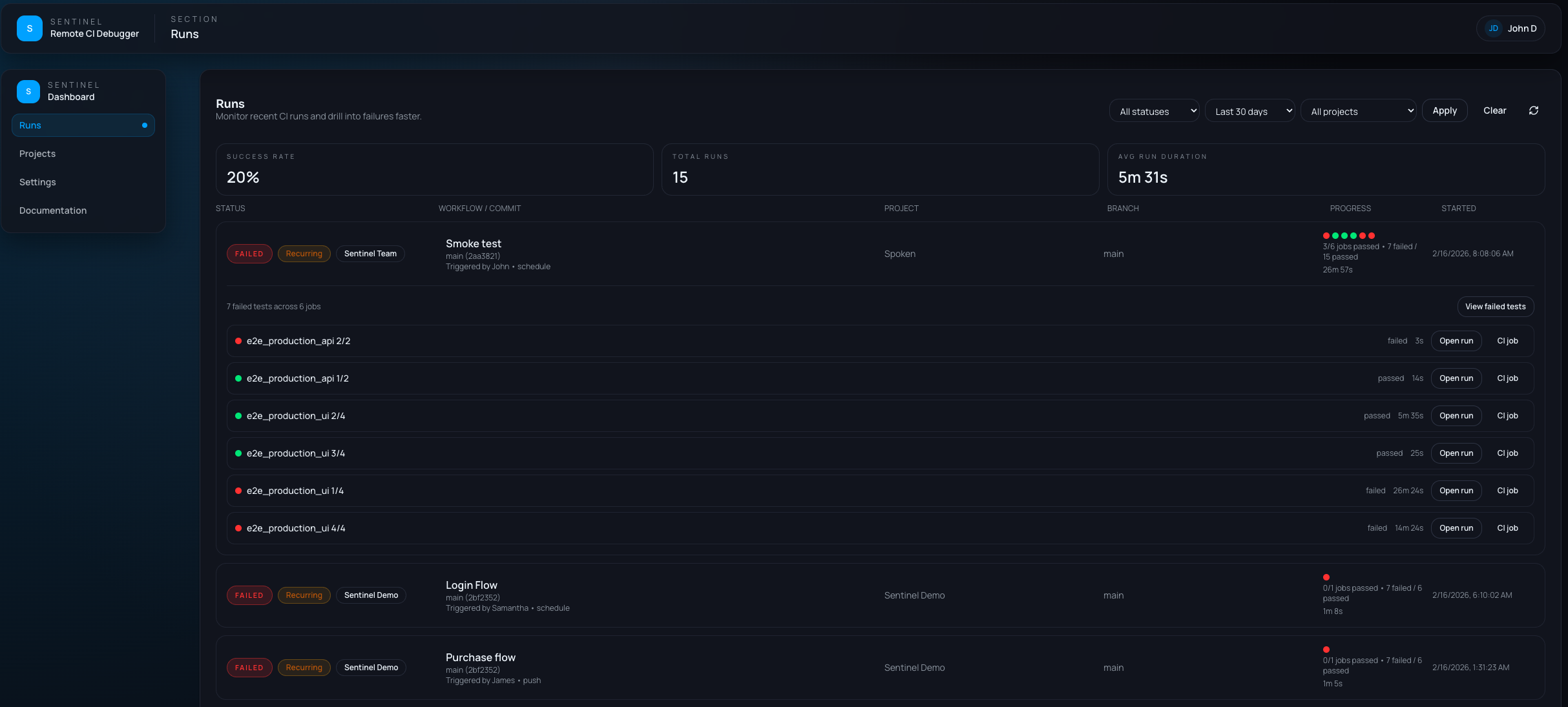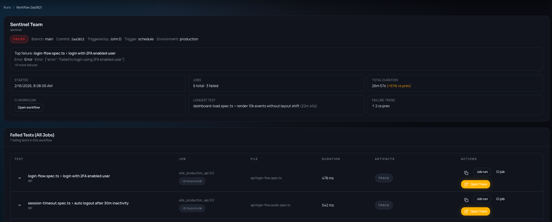 We aggregate every failed test from every parallel job into one structured, searchable dashboard. No more hunting. No more guessing. Just the failure.